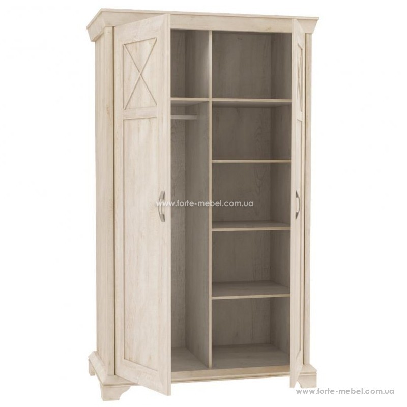 Двухдверный шкаф, изготовлен в декоре Пиния Белая . Характер мебели подчеркивается крестообразными мунтинами, массивными плинтусами и верхним ободом. Вся стилистика дополняется ручками в цвете, имитирующем старое серебро. Интерьер гардероба оборудован шестью емкими полками и вешалкой для одежды. Гардероб из коллекции мебели КАШМИР.