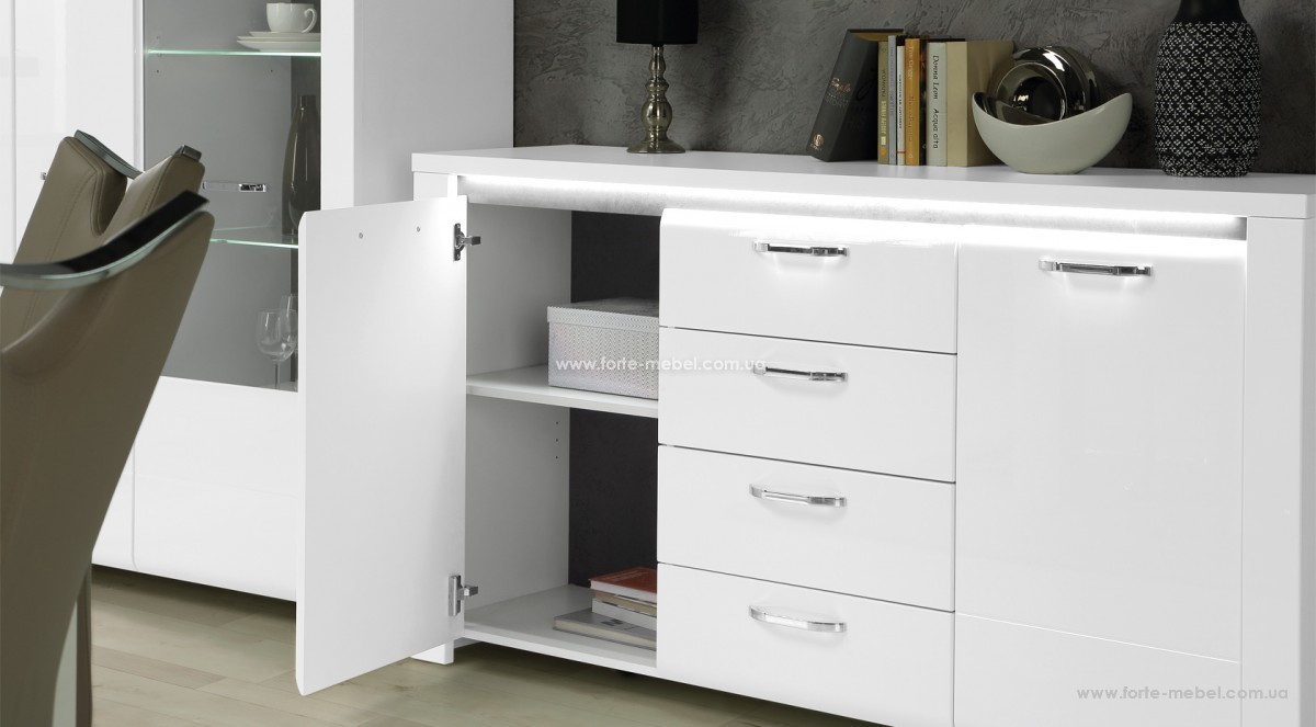 Самозакрывающиеся ящики и двери дополняют свет и гармонию, создаваемые светом. Яркие тона делают мебель идеально вписывающейся в любое пространство и углубляют его. Нежный характер коллекции не помешает ни интимным обедам на двоих, ни торжественным встречам в более широком кругу за раскладным столом.