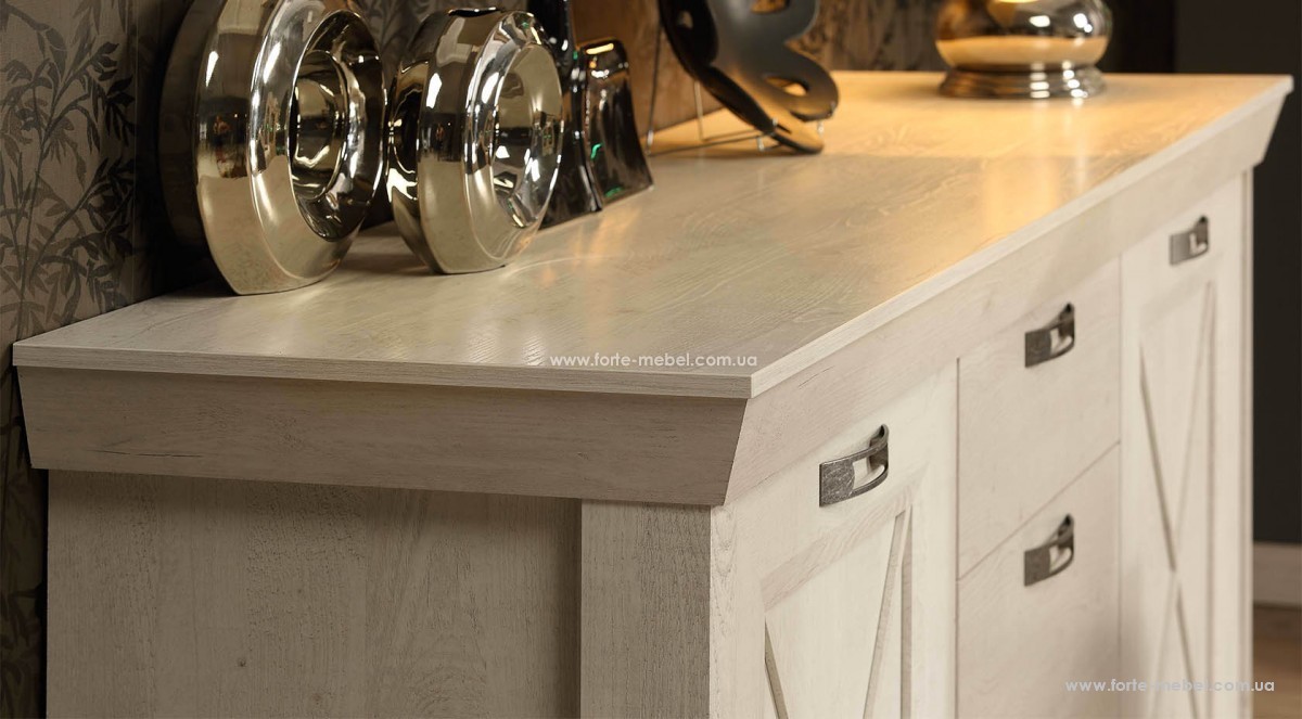 Легкая, тонкая тональность белого пальца завершает работы, создавая уникальный характер мебели. Отдельные блоки были обогащены декоративным элементом в виде перекрестных мер.